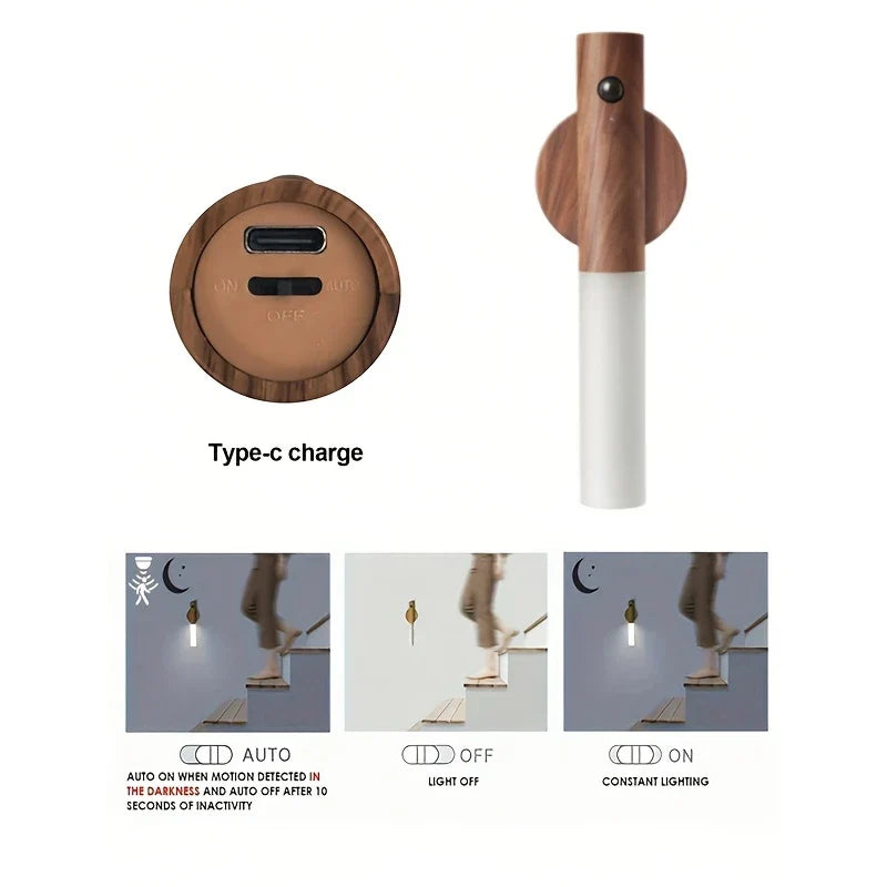 Motion Sensor Night Light, Magnetic Wall Lamp, USB Rechargeable LED Stick Light, Wireless Staircase Indoor Wooden Wall Closet Light for Hallway